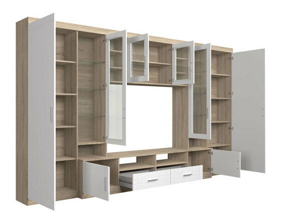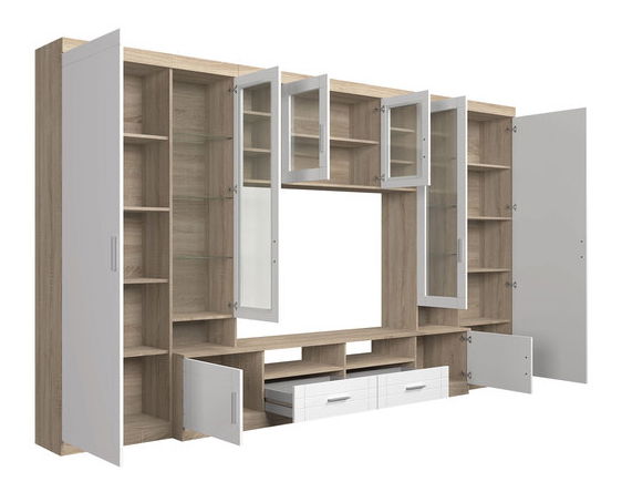 Obývací stěna Merasoja láká funkčností a zajímavým vzhledem. Díky systému prostorných polic jednoduše uskladníte nejen nádobí či používané ubrusy. V zákoutích nábytku najdete také spoustu praktických přihrádek na hromadění věcí. Nábytek má prosklené skříňky a otevřené police, na něž si můžete postavit své dekorace. Moderní design obývací stěny upoutá a módní barvy připomínají oblíbený skandinávský nábytek. Vyrobena je z kvalitní laminované desky, bude sloužit dlouhou dobu.