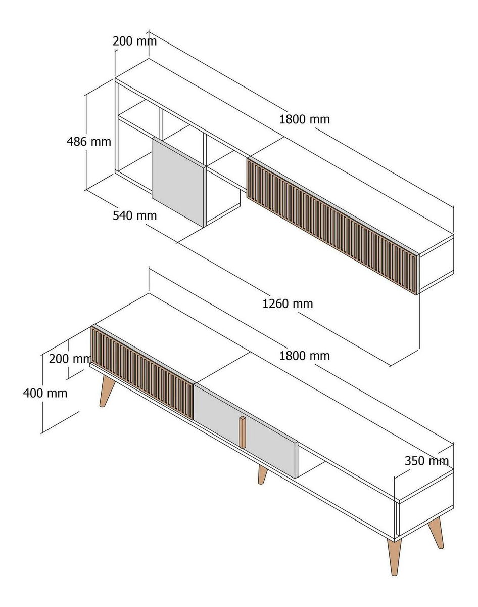 tloušťka: 18 mm, TV stojan: šířka: 180 cm, výška: 40 cm, hloubka: 35 cm, nástěnná police velikost: šířka: 180 cm, výška: 48,6 cm, hloubka: 20 cm, plastové nohy výška nohou: 20 cm