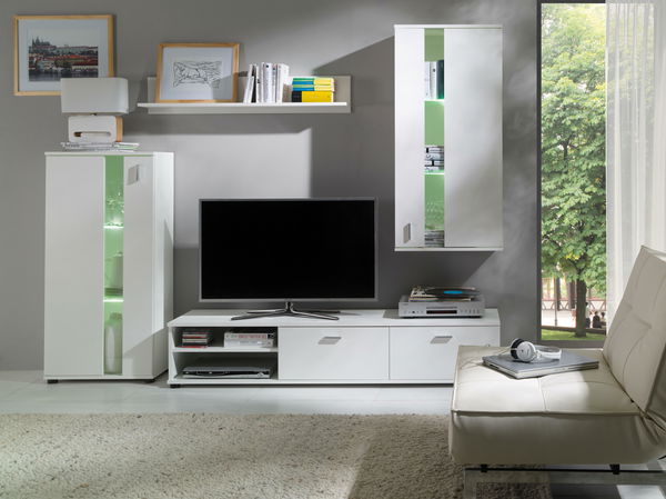 Přetvořte Váš obývací pokoj na příjemné a pohodlné místo, kde budete rádi trávit chvíle odpočinku při oblíbeném filmu či rozhovoru s rodinou a přáteli. Tato obývací stěna Vám poskytne vše potřebné. Krásné moderní vitríny pro knihy, sklo, porcelán a dekorace, široký TV stolek s místem pro audio/video zařízení a dvěma skříňkami a poličku. Barevné provedení segmentů je bílá.