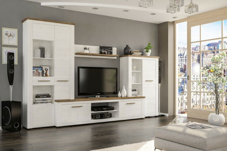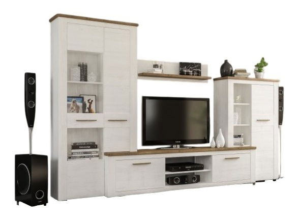 ZobrazitHledáte moderní obývací stěnu s nádechem klasiky? Obývačková stěna Mountain zaujme už na první pohled. Barva bílé borovice Andersen s jemnými hnědými akcenty dubu April je vhodná pro každou generaci. Stěna se skládá ze čtyř prvků, a to - TV stolek, 1x vitrína, 1x skříňka s otevřenými policemi a horní polička nad televizor. Obývací sestava vám umožní ukrýt mnoho věcí a na druhé straně vystavit to, co chcete obdivovat každý den. Nábytek je vyroben z kvalitního LTD s ABS hranami.