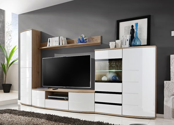 ZobrazitObývací stěna Olivia 24 SRW O1 (s osvětlením) o výšce 180 cm a hloubce 48 cm v San remo a lesk bílém provedení je moderní a nadčasová. Skříňka vlevo má dvě dvířka a dvě poličky, TV stolek má dvě uzavřené přihrádky, zásuvku a otevřený prostor nad ní. Vitrína na pravé straně má částečně prosklená dvířka a podsvícenou poličku. Plná dvířka a dvě poličky jsou v pravé části, a polička na zeď má nosnost až 10 kg. Všechna dvířka se otevírají systémem PUSH-CLICK. Desky jsou tlusté 22 cm. Rozměry obývací stěny jsou: skříň - 184 x 50 x 35 cm, TV stolek - 43 x 150 x 48 cm, vitrína - 125 x 100 x 36 cm, polička - 18 x 150 x 24 cm. Rozměry jednotlivých balíků jsou uvedeny v popisu produktu.