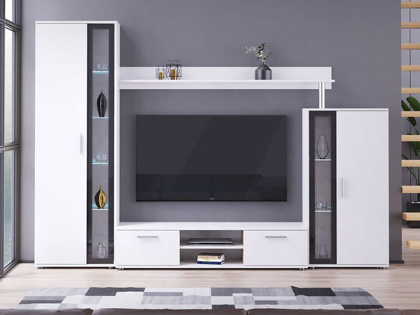 Obývací stěna Orenia (bílá + bílá + černé sklo) (bez osvětlení)