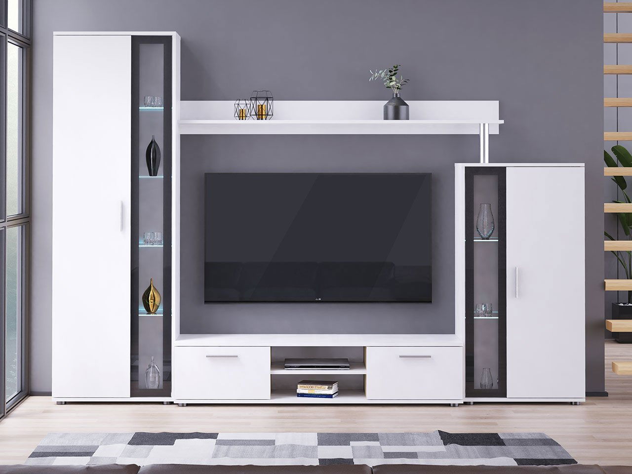 Obývací stěna Orenia (bílá + bílá + černé sklo) (osvětlení led bílé)