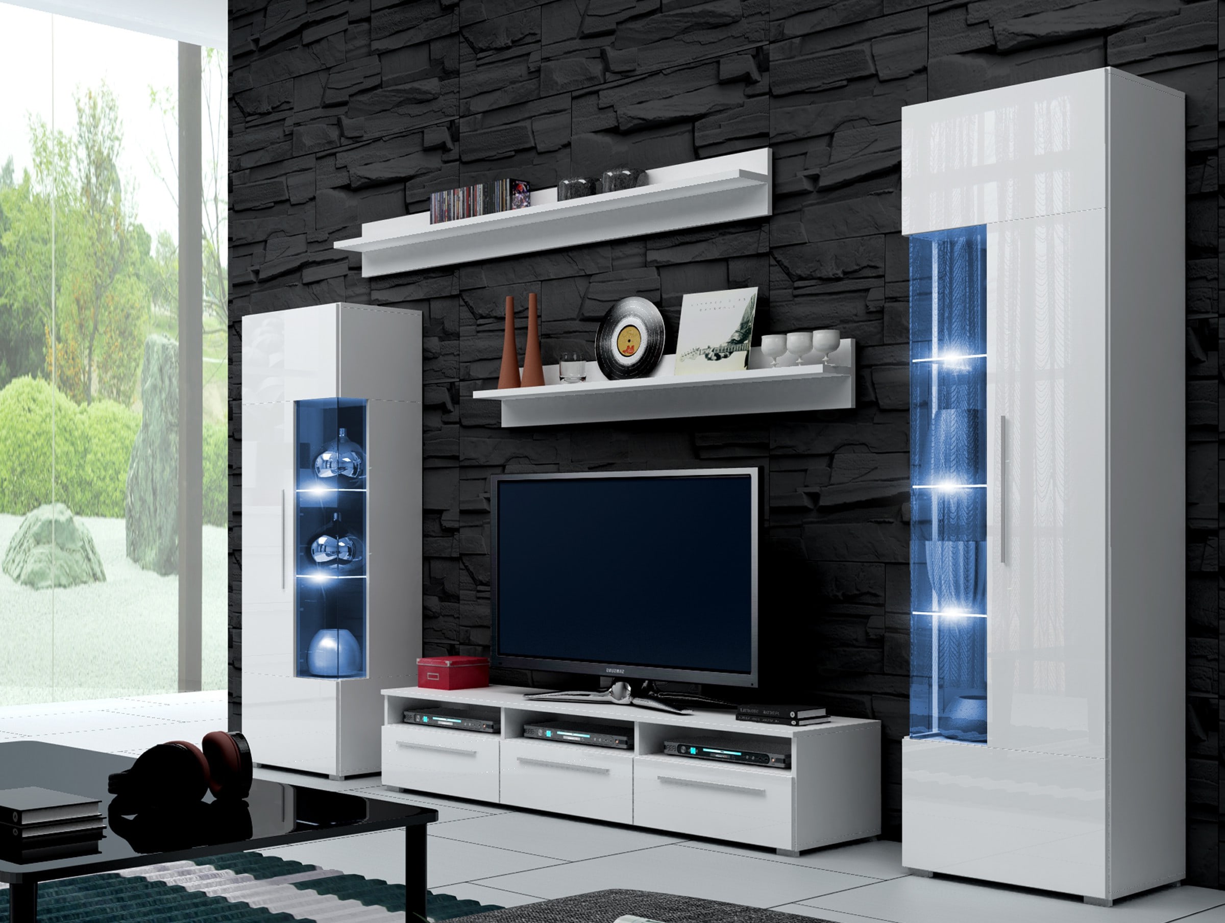 Obývací stěna Ramon I (bílá + lesk bílý) (s osvětlením)