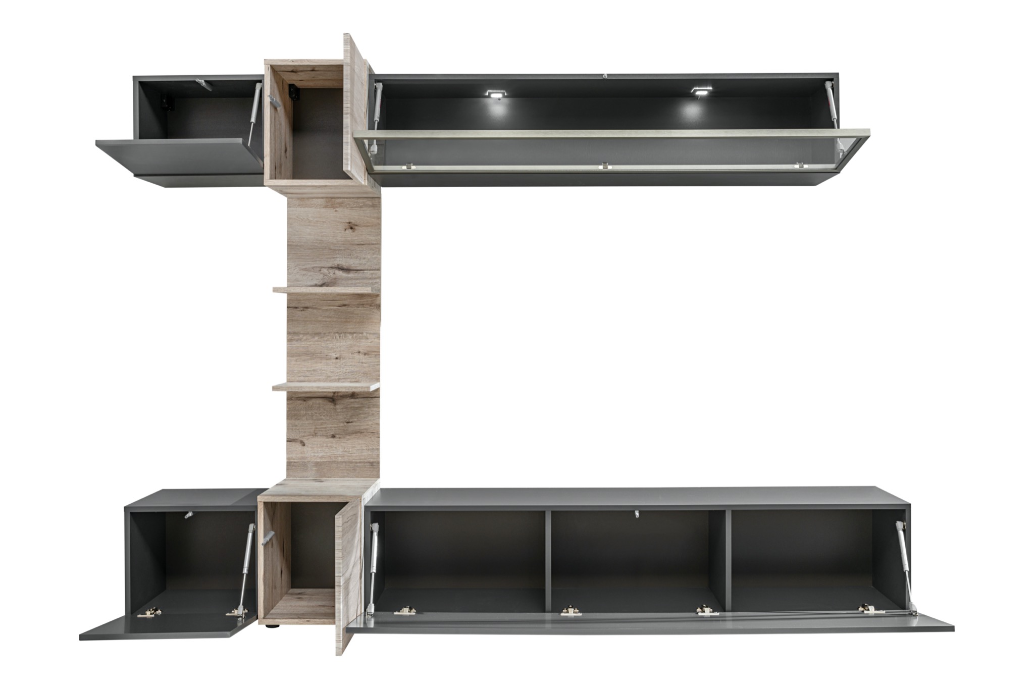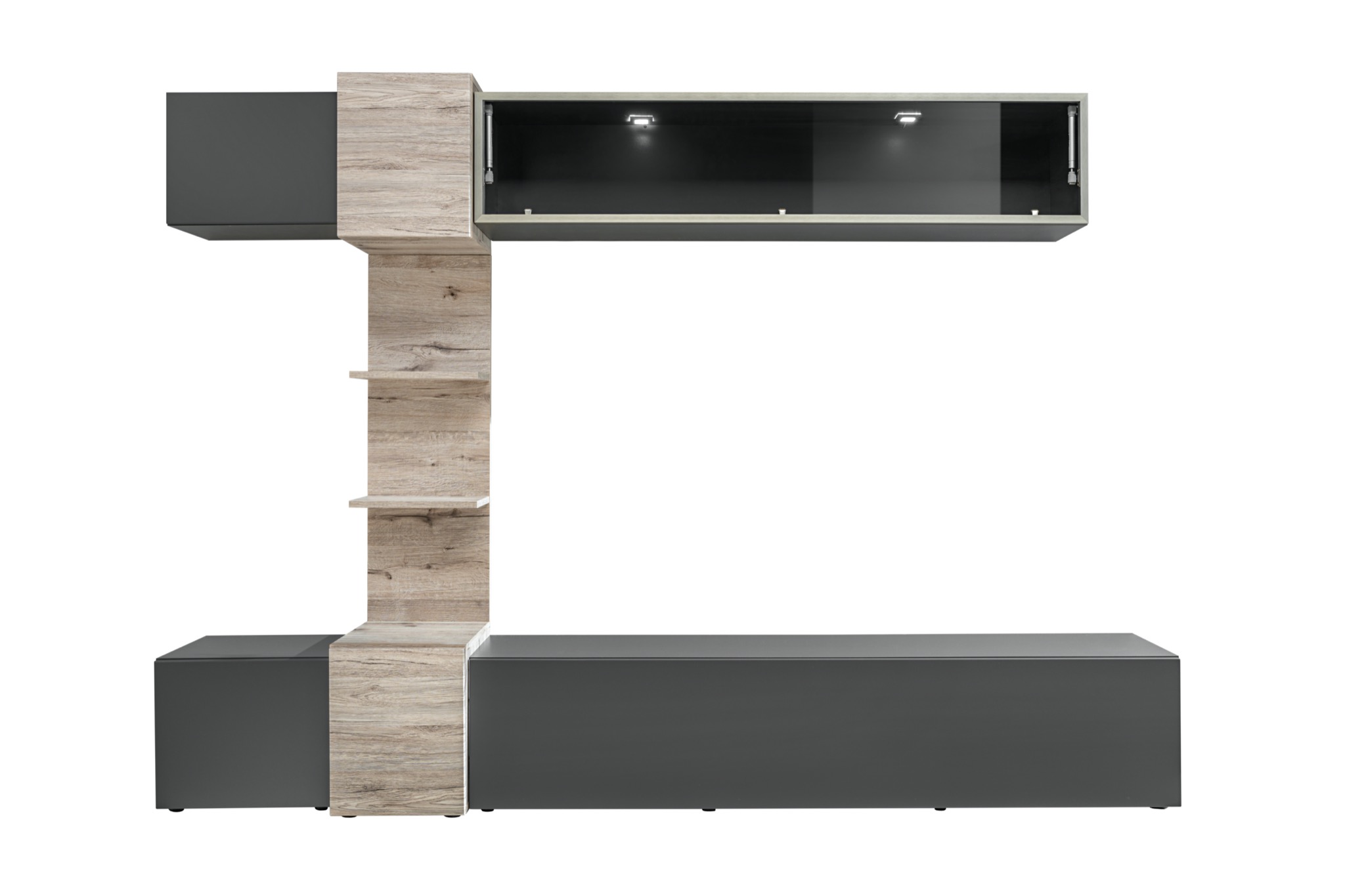 Stylové a nápadité provedení této obývací stěny přinese pocit spokojenosti. Matná antracitová barva vhodně sladěná s dubovým designem se stane atraktivní dekorací vašeho příbytku. Dostatek úložného prostoru zajišťují vhodně rozmístěné skříňky, TV stolek i poličky. Jistě oceníte i moderní osvícenou vitrínu. Obývací stěna nabízí i prostor na vystavení knížek, fotografii či suvenýrů, které zútulní váš příbytek.