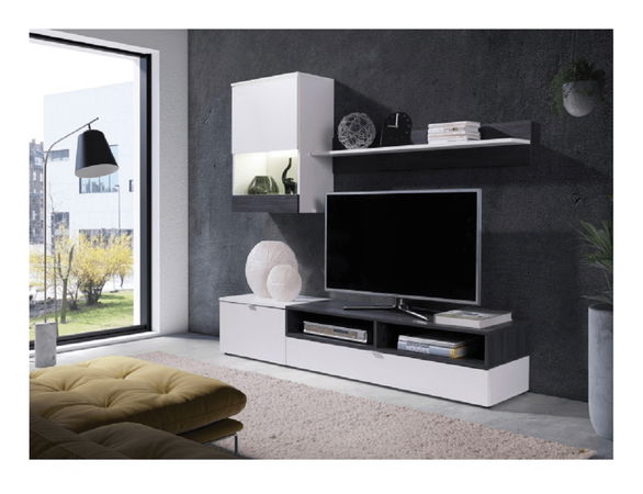 Stylová obývací stěna Roso byla navržena pro milovníky čistých linií a moderního designu. Vyrobena je z laminované DTD. Roso nabízí vše, co potřebujete: TV stolek, závěsnou vitrínu a polici. Možnost dokoupit LED osvětlení z naší nabídky.