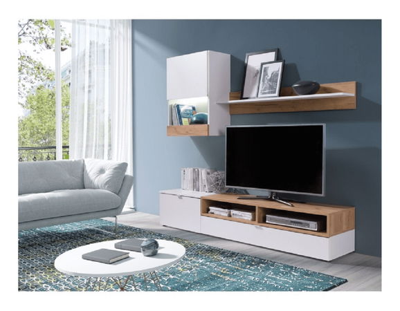 Stylová obývací stěna Roso byla navržena pro milovníky čistých linií a moderního designu. Vyrobena je z laminované DTD. Roso nabízí vše, co potřebujete: TV stolek, závěsnou vitrínu a polici. Možnost dokoupit LED osvětlení z naší nabídky.