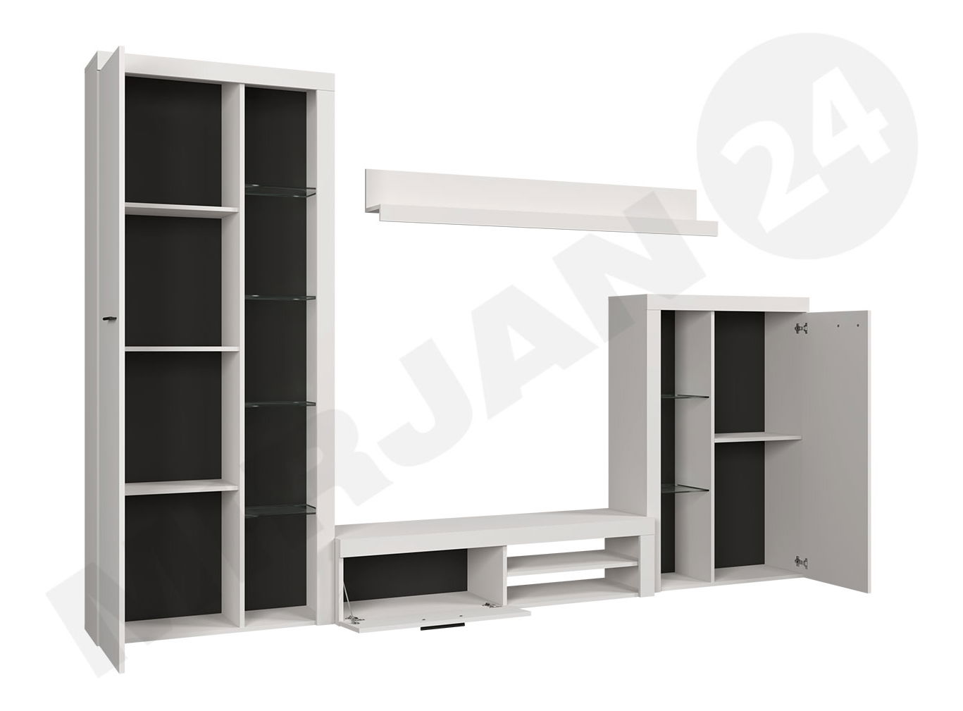 ZobrazitRokara je kompaktní obývací stěna sestávající z prostorné RTV skříňky, dvou vitrín - nízké a vysoké, nástěnné police a komody. Tato sestava je určena do malých obývacích pokojů i do prostorných obývacích pokojů. Nábytek poskytuje dostatek úložného prostoru. Skleněné police ve vitrínách a komoda mají navíc možnost LED osvětlení, které zvýrazní dekorace na nich umístěné a dodá jim jedinečný charakter. Obývací stěnu lze libovolně rozmístit, což zvyšuje možnosti uspořádání. Nábytek je vyroben z odolné laminované desky v univerzální barevné škále, kterou si můžete vybrat z možností dostupných na kartě výrobku.