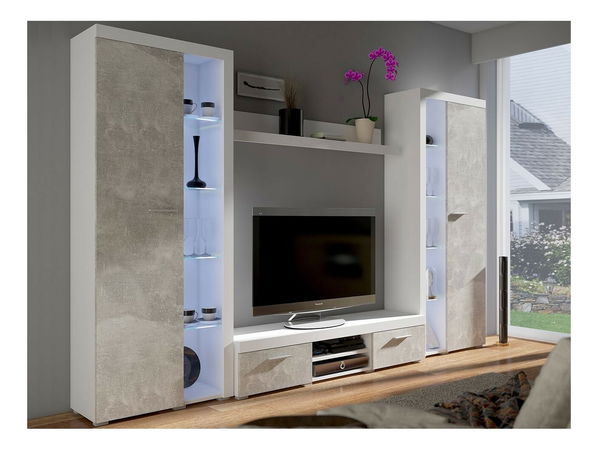 Extrémně funkční sada nábytku sestává především z vysoké skříňky. Díky systému dělených polic získáte praktický úložný prostor. Závěrečná část je prostorná police na doplňky, zatímco vitrína je zdobená skleněnými policemi na dekorace a rodinnými suvenýry. V další možnosti si můžete pořídit LED osvětlení, které dodá vašemu interiéru atmosférickou záři. Televizní skříňka zabudovaná do nástěnné jednotky do obývacího pokoje je kombinací prolamovaných polic (pro dekodér a reproduktor) s otočnými policemi na příslušenství. Stěnovou jednotku doplňuje stabilní police, kterou můžete zavěsit na televizor. Jeho délka je přizpůsobena televiznímu stolu. Díky módním barevným kombinacím nástěnných jednotek bude možné úspěšně zapadnout do skandinávských, průmyslových a minimalistických interiérů.