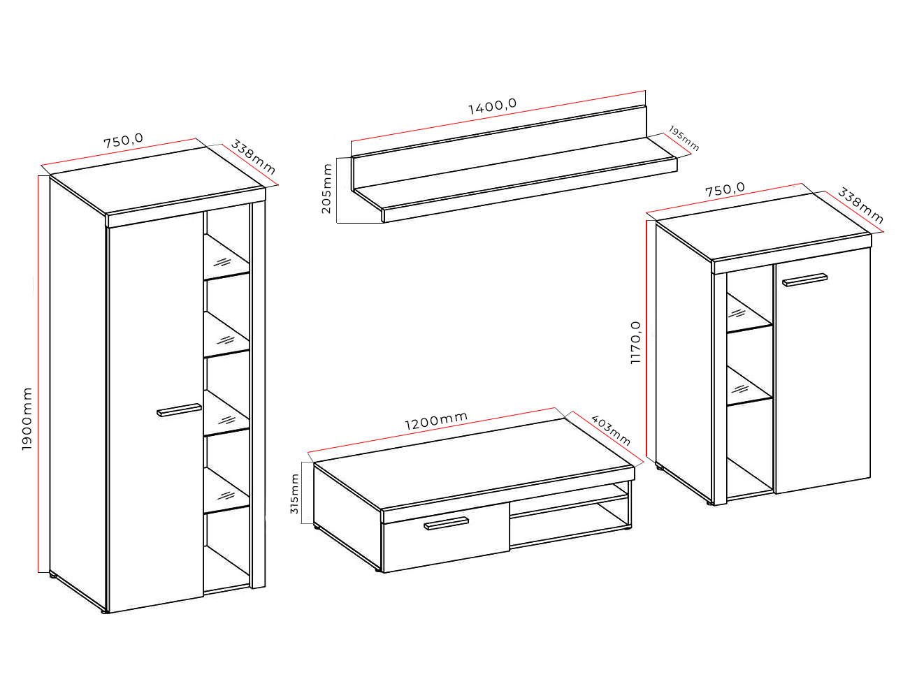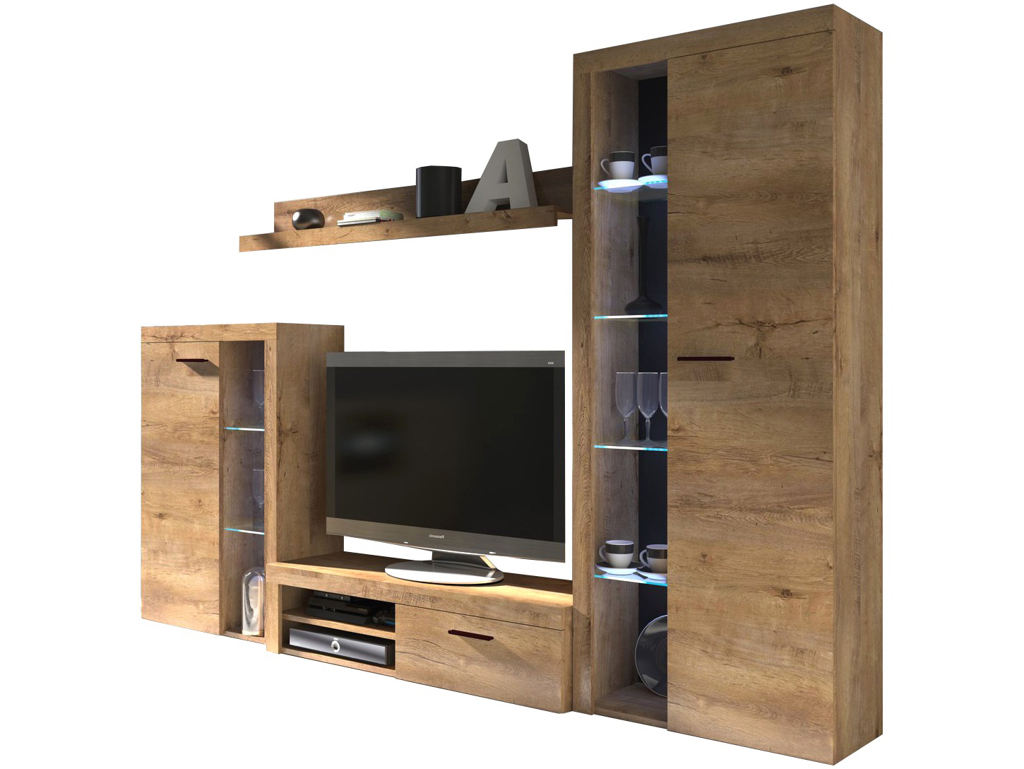 Obývací stěna, sestává ze čtyř prvků. TV stolek s výklopnými dvířky a otevřeným prostorem s poličkou pro umístění AV techniky. Vysoká vitrína má tři dřevěné poličky za dvířky a čtyři skleněné poličky v otevřené. Nižší vitrína dřevěnou poličku za dvířky a dvě skleněné poličky v otevřené. Obývací sestavu již doplňuje pouze jednoduchá polička na zeď. K těm si můžete přiobjednat efektní LED osvětlení.