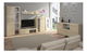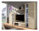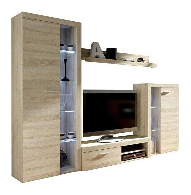 Obývací stěna, sestává ze čtyř prvků. TV stolek s výklopnými dvířky a otevřeným prostorem s poličkou pro umístění AV techniky. Vysoká vitrína má tři dřevěné poličky za dvířky a čtyři skleněné poličky v otevřené. Nižší vitrína dřevěnou poličku za dvířky a dvě skleněné poličky v otevřené. Obývací sestavu již doplňuje pouze jednoduchá polička na zeď. K těm si můžete přiobjednat efektní LED osvětlení.