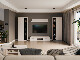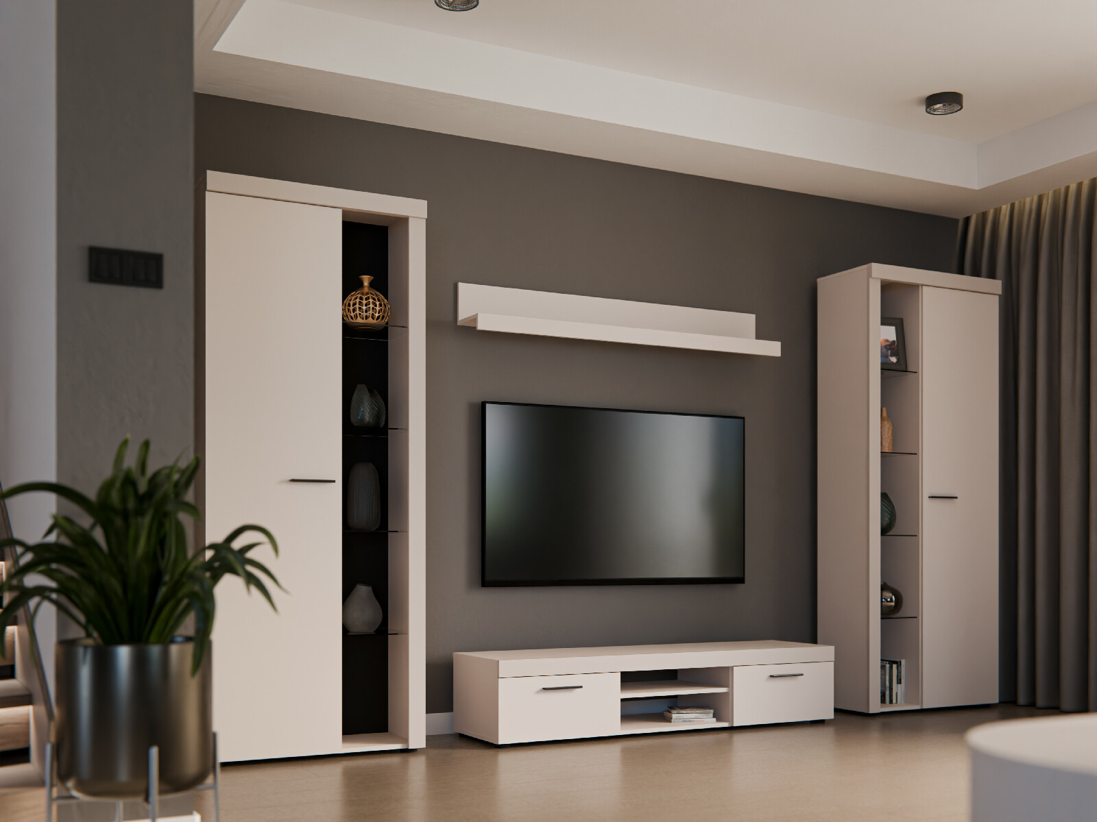Obývací stěna, sestává ze čtyř prvků. TV stolek s výklopnými dvířky a otevřeným prostorem s poličkou pro umístění AV techniky. Vysoká vitrína má tři dřevěné poličky za dvířky a čtyři skleněné poličky v otevřené. Obývací sestavu již doplňuje pouze jednoduchá polička na zeď. K těm si můžete přiobjednat efektní LED osvětlení.