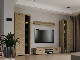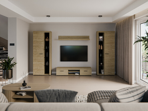 Obývací stěna, sestává ze čtyř prvků. TV stolek s výklopnými dvířky a otevřeným prostorem s poličkou pro umístění AV techniky. Vysoká vitrína má tři dřevěné poličky za dvířky a čtyři skleněné poličky v otevřené. Obývací sestavu již doplňuje pouze jednoduchá polička na zeď. K těm si můžete přiobjednat efektní LED osvětlení.