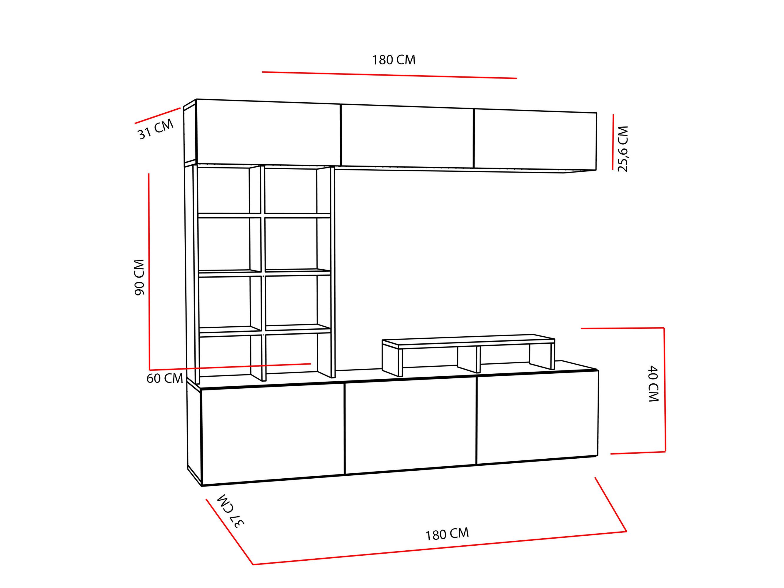 tloušťka: 18 mm, velikost TV stojanu: šířka: 180 cm, výška: 40 cm, hloubka: 37 cm, velikost nástěnné police: šířka: 180 cm, výška: 26,5 cm, hloubka: 31 cm, velikost skříňky: šířka: 60 cm, výška: 90 cm, hloubka: 31 cm