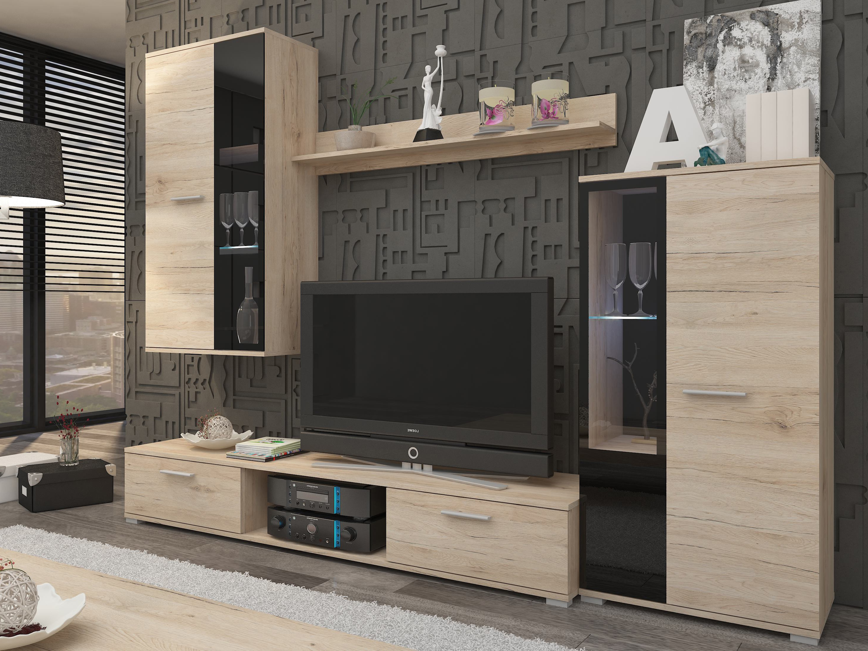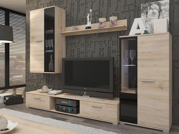 Designově zajímavá obývací stěna, která zaujme na první pohled. K úplné dokonalosti této stěny doporučujeme dokoupit i LED osvětlení. Nábytek je dodáván v demontu a tak se nemusíte bát že neprojde přes dveře.