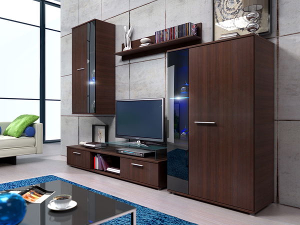 Designově zajímavá obývací stěna, která zaujme na první pohled. K úplné dokonalosti této stěny doporučujeme dokoupit i LED osvětlení a ještě jednu vitrínu. Nábytek je dodáván v demontu a tak se nemusíte bát že neprojde přes dveře.