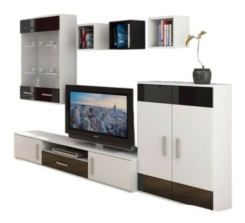 ZobrazitObývací stěna Scotty Bílá + Lesk černý výška 190 cm hloubka 22-52 cm Bílá + Lesk černý je skvělým doplňkem pro Váš obývací pokoj. Stěna sestává z dvoudílné vitríny, nízkého a širokého TV stolku nebo skříňky, praktické a stylové dvoudílné mělké skříňky se 2 dvířky a tří uzavřených poliček ve stejném čtvercovém tvaru. Vitrína má 2 skleněné poličky a šedé vodorovné úchyty, které jí dodávají styl. TV stolek má místo na audio/video zařízení s jednou otevřenou poličkou a jednou mělkou zásuvkou. Šedé tenké úchyty a drobné nožičky dodávají stolu elegantní vzhled. Skříňka má 2 dvířka s šedými vkusnými svislými úchyty. Tři uzavřené poličky se stejným čtvercovým tvarem a bez zadní stěny jsou skvělým místem pro uskladnění věcí.