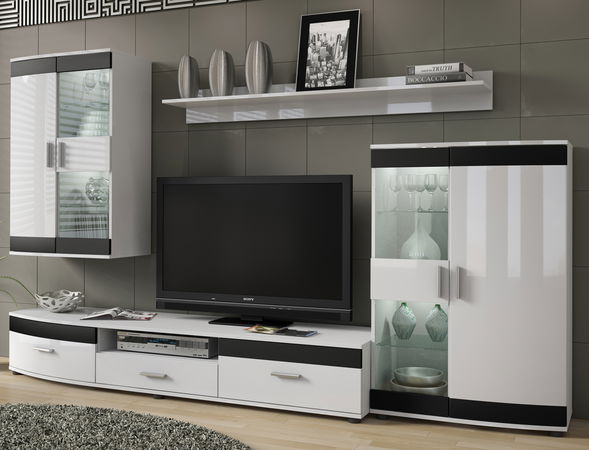 Obývací stěna je důležitý kus nábytku v obývacím pokoji. Spolu se sedačkou a konferenčním stolkem vytvářejí dokonalou souhru každého obýváku. Nabízí dostatek úložného a odkládacího prostoru v podobě čtyř prvků: vitríny na zeď, stojící vitríny, TV stolku a poličky. Korpus je bílé barvy přičemž fronty jsou v bílém lesku doplněné o dekorační černé pruhy.