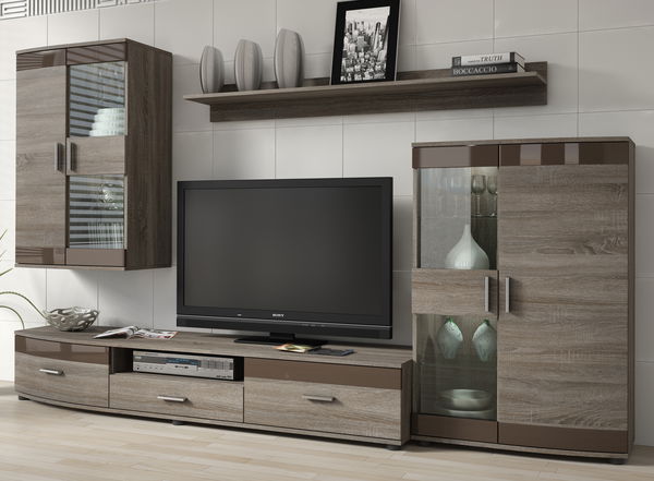 Obývací stěna je důležitý kus nábytku v obývacím pokoji. Spolu se sedačkou a konferenčním stolkem vytvářejí dokonalou souhru každého obýváku. Nabízí dostatek úložného a odkládacího prostoru v podobě čtyř prvků: vitríny na zeď, stojící vitríny, TV stolku a poličky. Moderní barevné provedení dřeva dub sonoma truflová je doplněno o dekorační hnědé pásy.