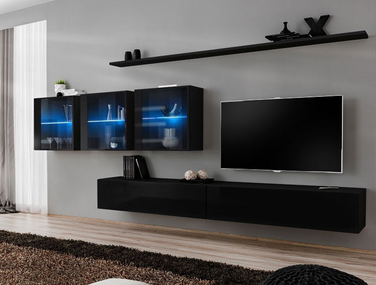 Obývací stěna Silloth 26 ZZ SW 17 (s osvětlením) Černá matná + Černý vysoký lesk je moderní nábytek pro Váš obývací prostor. Otevírání dveří je systémem push-click a jsou univerzální, takže si je můžete namontovat na levou nebo pravou stranu. Tento nábytek má ABS hrany, které jsou odolné proti mechanickému poškození a váš nábytek bude vypadat dlouho jako nový. Design je doplněn o LED podsvícení. Rozměry skříňky na zeď jsou 60 x 60 x 30 cm, polička má rozměry 2, 2 x 180 x 20 cm a TV stolek/skříňka má rozměry 40 x 120 x 30 cm. Balíček Nr. 1 má rozměry 138 x 40 x 8 cm a váží 21 kg. 2 má rozměry 138 x 40 x 8 cm a váží 21 kg. 3 má rozměry 129 x 22 x 3 cm a váží 4 kg. 4 má rozměry 129 x 22 x 3 cm a váží 4 kg. 5 má rozměry 78 x 62 x 8 cm a váží 15 kg. 6 má rozměry 78 x 62 x 8 cm a váží 15 kg. Balíček Nr. 7 má rozměry 78 x 62 x 8 cm a váží 15 kg.