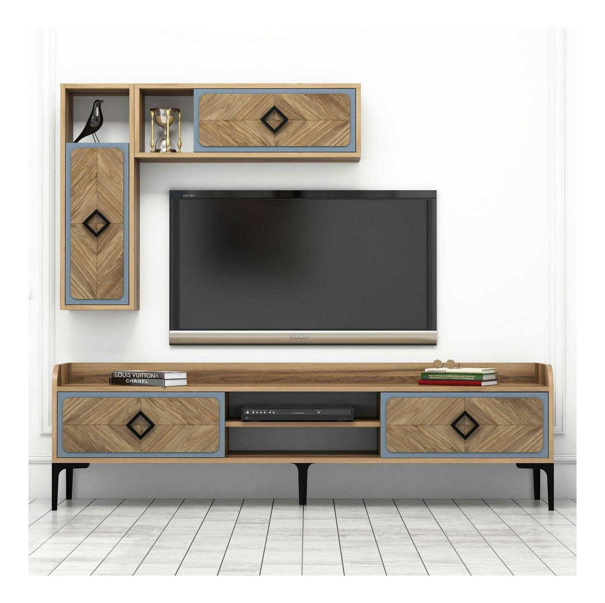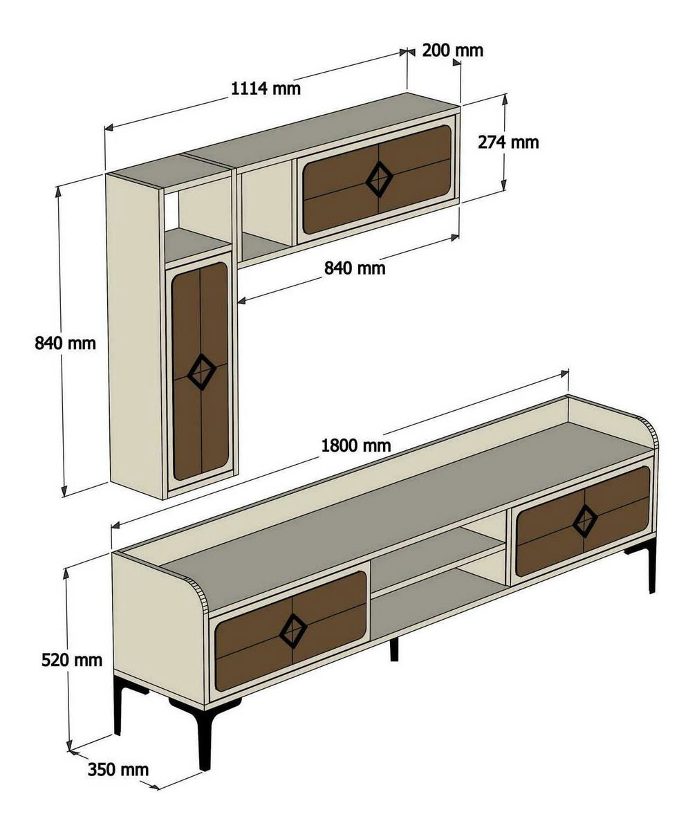 tloušťka: 18 mm, TV jednotka: šířka: 180 cm, výška: 52 cm, hloubka: 35 cm, nástěnná police: šířka: 27,4 cm, výška: 84 cm, hloubka: 20 cm
