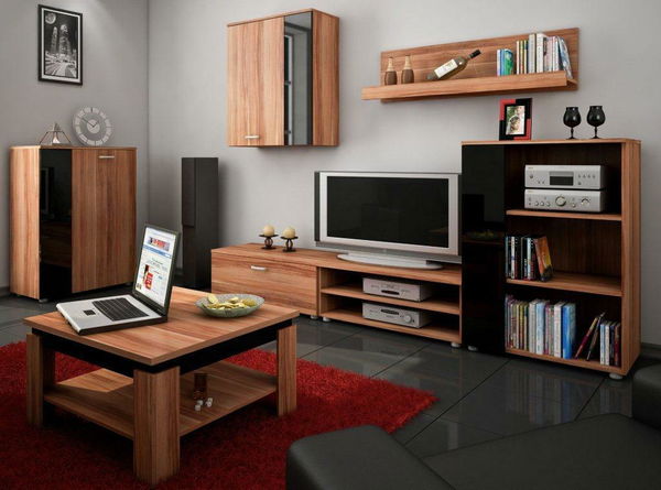 Levý TV stolek 32 x 85 x 38 cm, pravý TV stolek 32 x 82 x 38 cm, stojící komoda 98 x 70 x 35 cm, polička 32 x 110 x 22 cm, závěsná skříňka 80 x 70 x 27 cm (výška x šířka x hloubka)