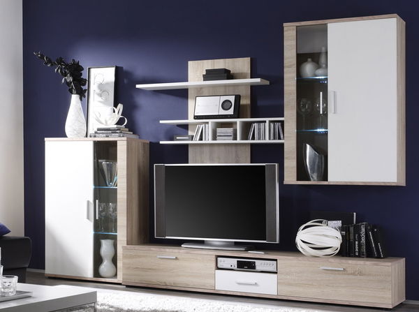 Obývací stěna Smart světlé barvy je vhodná do moderně zařízených obývacích pokojů a díky své kompaktnosti najde využití i v menších prostorech. Je vyrobena z laminované DTD v barevném provedení dřeva dub světlý/sonoma v kombinaci s bílou. Prosklené části jsou dodávány s efektním LED osvětlením s modrým podbarvením. To nejen zvýrazní předměty umístěné v nich, ale i navodí příjemnou atmosféru celého prostoru.