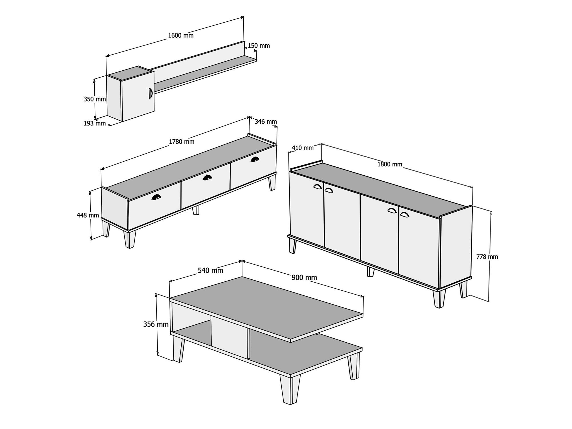tloušťka: 18 mm, velikost TV stojanu: šířka: 178 cm, výška: 44,8 cm, hloubka: 34,6 cm, velikost police: šířka: 160 cm, výška: 35 cm, hloubka: 19,3 cm, velikost konzoly : šířka: 180 cm, výška: 77,8 cm, hloubka: 41 cm, rozměr konferenčního stolku: šířka: 90 cm, výška: 35,6 cm, hloubka: 54 cm