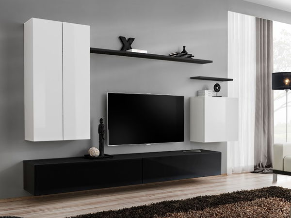 Obývací stěna Stanwick - 26 WS SW 2 Bílá matná + Lesk bílý vysoký / Černá matná + Černý vysoký lesk je moderní nábytek pro váš moderní obývací prostor. Tato stěna má univerzální stranu dvířek, umožňující jejich umístění v libovolném směru. Stěna neobsahuje osvětlení, takže máte možnost si vybrat vlastní typ osvětlení. Tento nábytek má push-click systém dvířek, což znamená, že je můžete otevírat a zavírat bez použití kliky. Stěna je vyrobena z kvalitních materiálů a její design dokonale doplní váš interiér. Balíček obsahuje velkou skříňku na zeď, TV stolek/skříňku, dlouhou a krátkou poličku a malou skříňku na zeď. Rozměry balíků jsou uvedeny v popisu produktu. S touto obývací stěnou získáte moderní nábytek pro váš domov s praktickým a kvalitním designem.