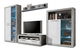 Moderní obývací stěna, která v sobě spojuje neutrální šedé barevné provedení, fornty v bílém lesku a tenké designové linie. Zosatava se skládá z vysoké vitríny, nižší vitríny, TV stolku s poličkou pro audio/video zařízení a širší poličky. Vitríny jsou efektně podsvíceny LED osvětlením.
