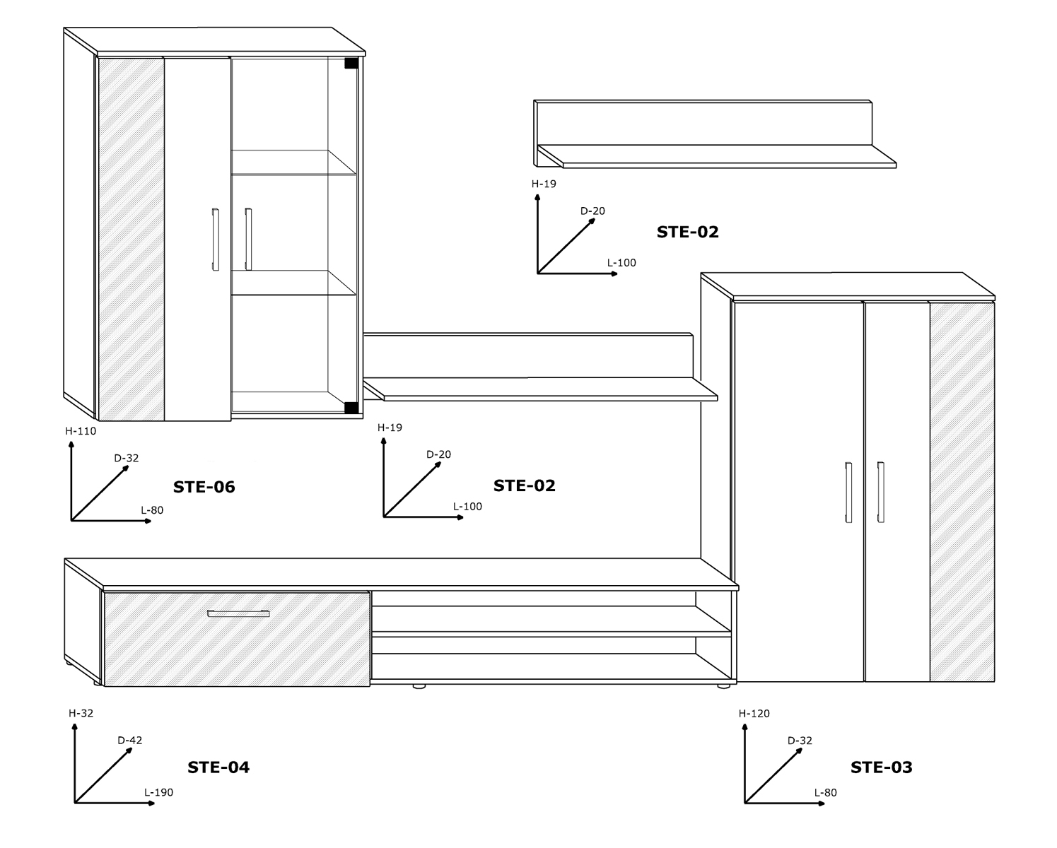 Moderní obývací stěna Stella je dostupná až v osmi barevných kombinacích a tak si můžete zařídit obývací pokoj podle Vašich představ. Je složená z pěti prvků, což využijete při menším prostoru, ale pokud byste potřebovali více odkládacího a úložného prostoru, je možné si přiobjednat praktickou komodu a šatní skříň. Vyobrazený model je v barevném provedení dřeva švestka v kombinaci s černým leskem.