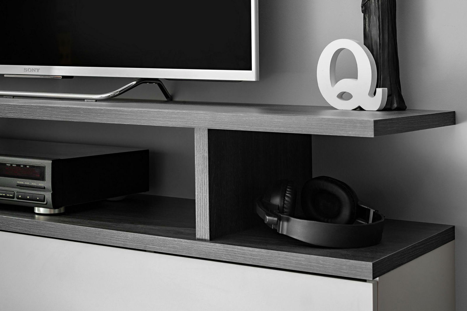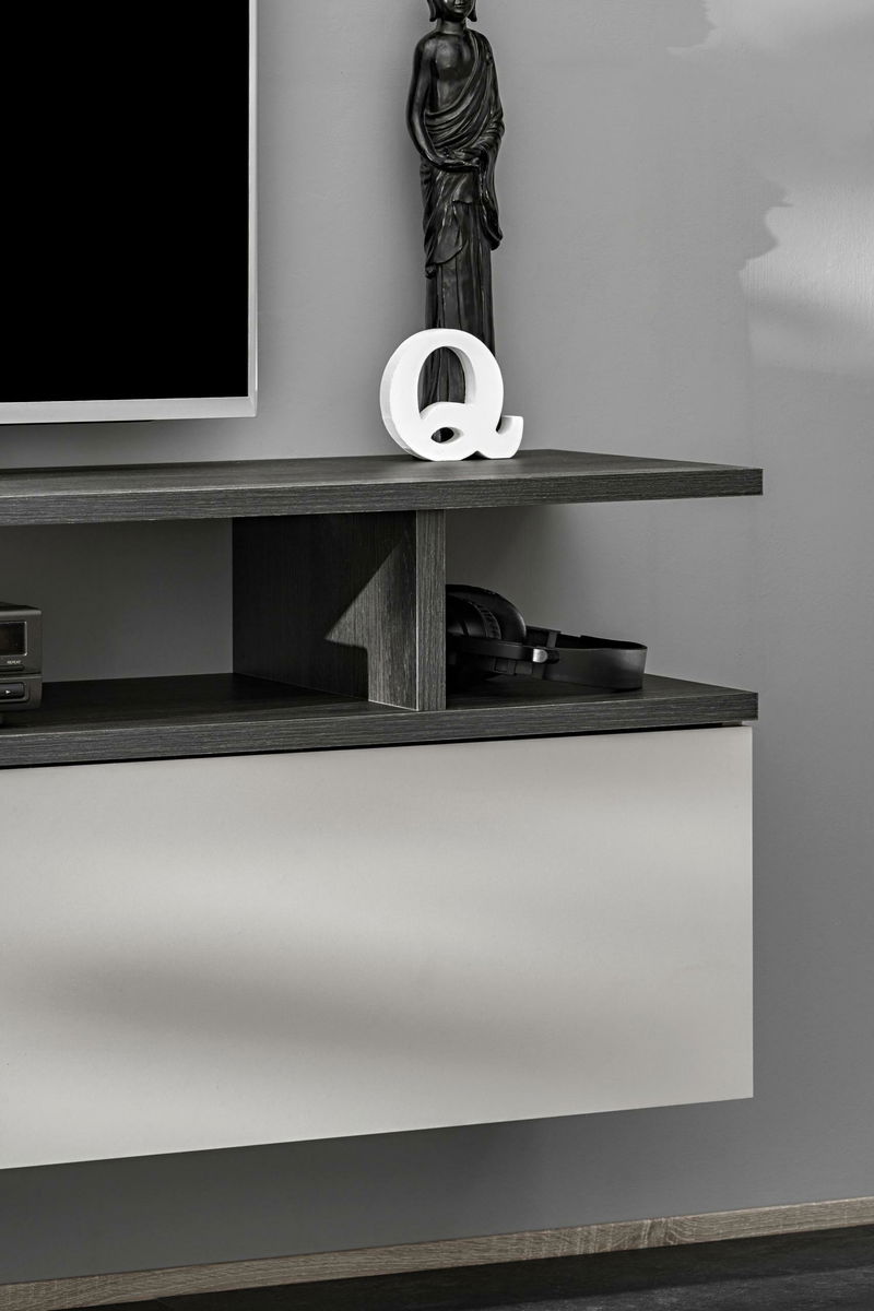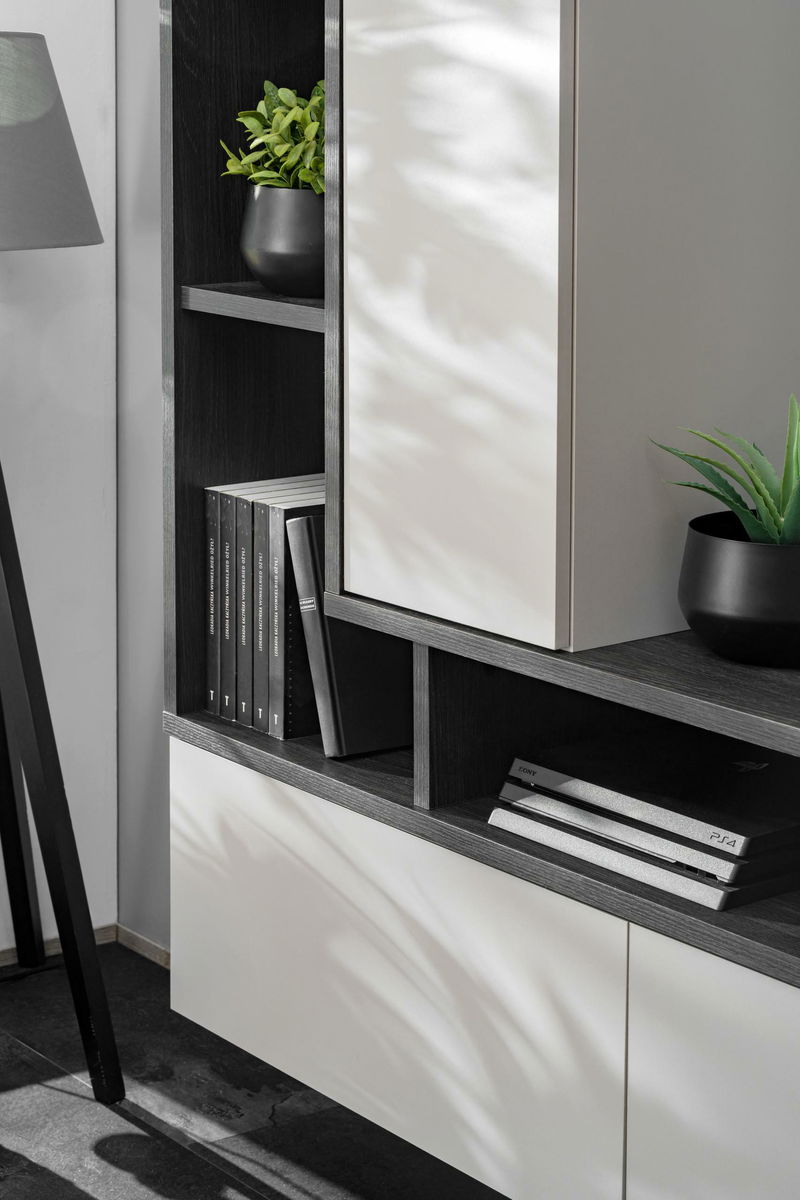 Obývací stěna Tacan kombinuje moderní design s praktickým využitím prostoru a nabízí ideální řešení pro stylové a funkční vybavení obývacího prostoru vašeho domova. Závěsná skříňka má masivní dvířka, která zajišťují čistý a minimalistický vzhled. Dvířka se otevírají snadno a spolehlivě. Tyto přihrádky jsou ideální pro uložení dokumentů, doplňků, knih nebo jiných předmětů, které chcete mít po ruce, a přitom skryté před zraky. Výklopná konstrukce skříně pomáhá šetřit místo a působí moderně a vzdušně. Skříňka pod televizor je navržena s důrazem na funkčnost a moderní vzhled. Má tři výklopné části, které se otevírají pomocí systému push-click - stačí jemně zatlačit a dvířka se plynule otevřou. Tento systém bez západky v kombinaci s plynovými pružinami zajišťuje pohodlné a tiché používání. Za panty se nachází jedna prostorná přihrádka, která poskytuje dostatek místa pro elektroniku nebo příslušenství. Kromě toho skříň nabízí také otevřené police, které jsou ideální pro vystavení dekorací, uložení médií nebo předmětů denní potřeby. Obývací stěna tak kombinuje elegantní design s vysokou mírou praktičnosti a skvěle zapadne do moderního interiéru.