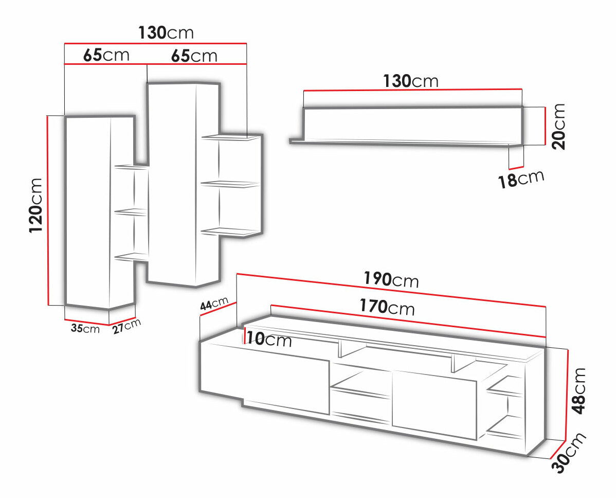 ZobrazitTess je moderní obývací stěna, která je ideální pro malé i prostorné obývací pokoje či obýváky. Moderní vzhled je doplněn o systém otevírání bez úchytů. Obývací stěna Tess sestává z prostorné televizní skříňky, která dokonale skryje kabeláž elektrických zařízení, ale také umožní uložení potřebných věcí. Police dokonale zvýrazní vystavené ozdoby nebo knihy. Závěsné skříňky jsou rozděleny na dvě části: otevřené a skryté. Obývací stěna je vyrobena z kvalitních materiálů - laminovaná deska, která je odolná proti poškrábání a vlhkosti.