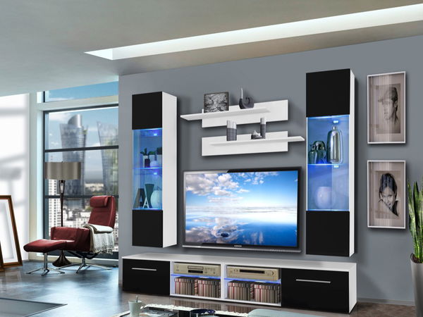 Jednoduchý a moderní design obývací stěny je doplněn o systém push-click, který je využit při vitríně. Obývací stěna je doplněna o LED podsvícení.