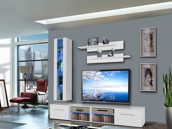 Jednoduchý a moderní design obývací stěny je doplněn o systém push-click, který je využit při vitríně. Obývací stěna je doplněna o LED podsvícení.