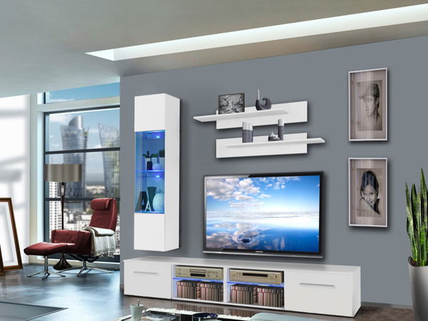 Jednoduchý a moderní design obývací stěny je doplněn o systém push-click, který je využit při vitríně. Obývací stěna je doplněna o LED podsvícení.