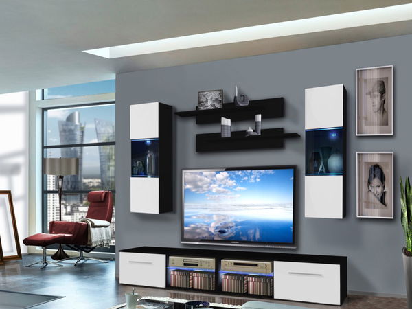 Jednoduchý a moderní design obývací stěny je doplněn o systém push-click, který je využit při vitríně. Obývací stěna je doplněna o LED podsvícení.