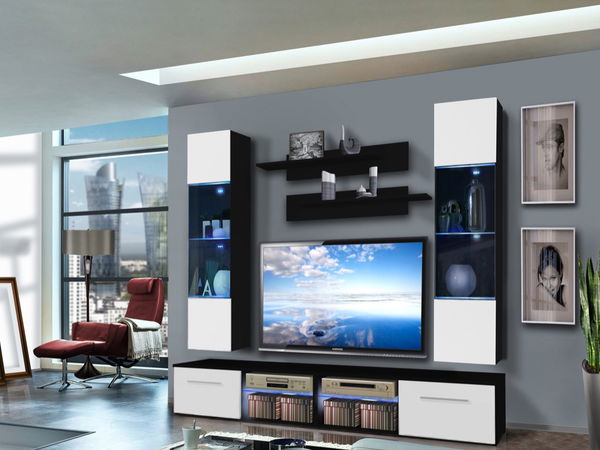 Jednoduchý a moderní design obývací stěny je doplněn o systém push-click, který je využit při vitríně. Obývací stěna je doplněna o LED podsvícení.