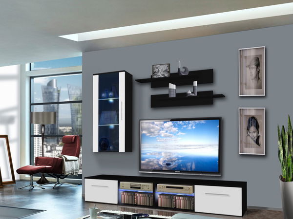 Jednoduchý a moderní design obývací stěny je doplněn o systém push-click, který je využit při vitríně. Obývací stěna je doplněna o LED podsvícení.