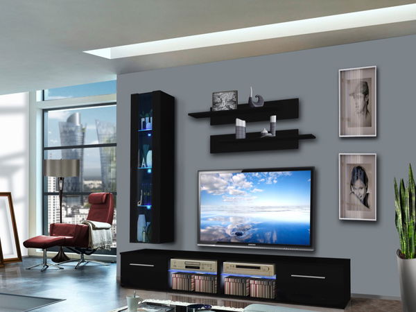 Jednoduchý a moderní design obývací stěny je doplněn o systém push-click, který je využit při vitríně. Obývací stěna je doplněna o LED podsvícení.