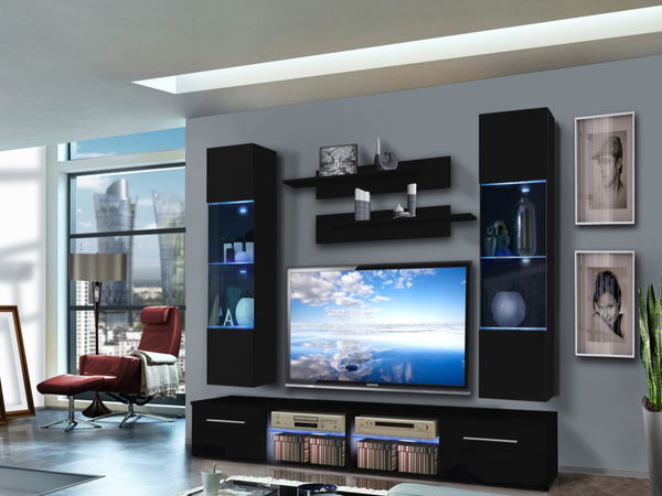 Jednoduchý a moderní design obývací stěny je doplněn o systém push-click, který je využit při vitríně. Obývací stěna je doplněna o LED podsvícení.
