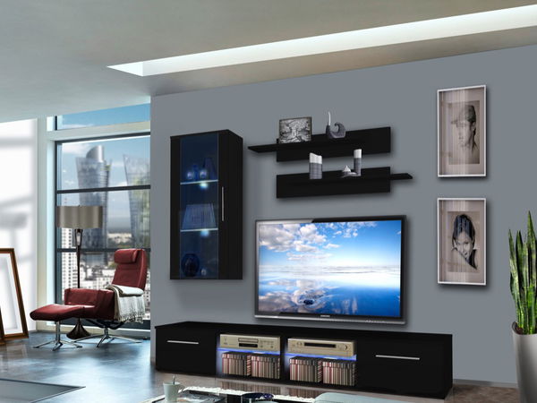 Jednoduchý a moderní design obývací stěny je doplněn o systém push-click, který je využit při vitríně. Obývací stěna je doplněna o LED podsvícení.
