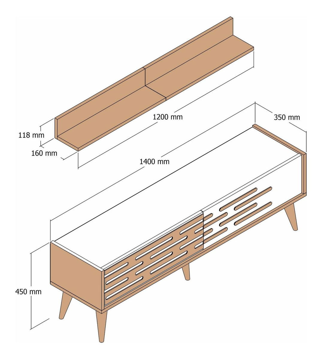 tloušťka: 18 mm, velikost TV stojanu: šířka: 140 cm, výška: 35 cm, hloubka: 45 cm, velikost nástěnné police: šířka: 120 cm, výška: 16 cm, hloubka: 11,8 cm