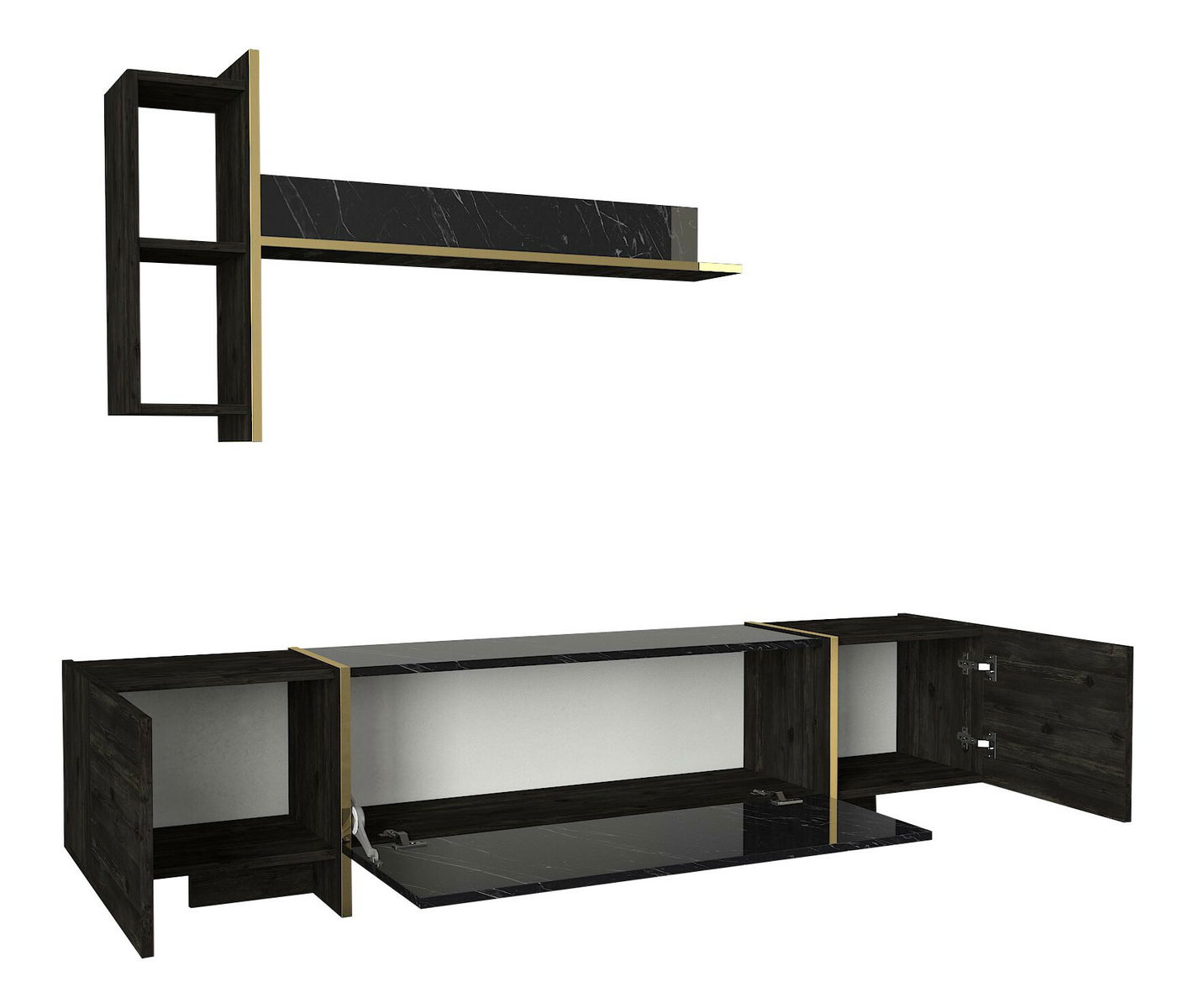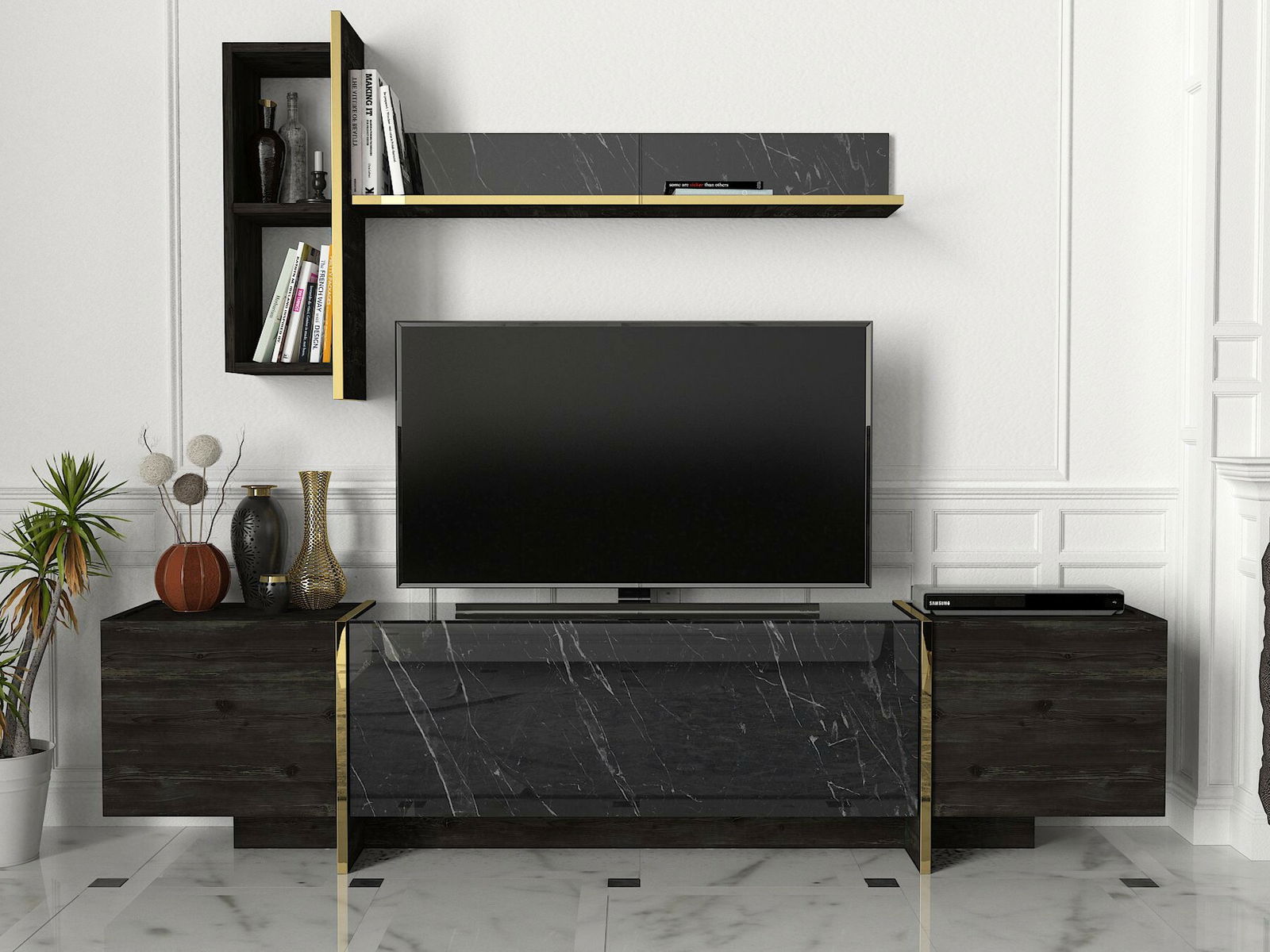 Obývací stěna Veya má výšku 45 cm, šířku 180 cm a hloubku 32.3 cm. Její moderní a elegantní design v černém a zlatém provedení přinese nový styl vašemu obývacímu prostoru. Obývací stěna je vyrobena z kvalitní 100% melaminové desky, která zajišťuje stabilitu a odolnost. Díky široké ploše nabízí dostatek prostoru pro vaši televizi a další zařízení. S obývací stěnou Veya můžete zařídit svůj obývací pokoj a užít si pohodlné sledování televize is velkým počtem návštěvníků.