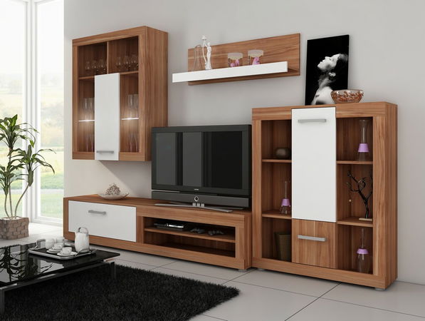 Moderní obývací stěna Viki je vhodná jak do malých tak i větších prostorů. Ke čtyřem prvkům si v případě potřeby můžete přiobjednat prostorný regál a šatní skříň. Na výběr máte až z osmi barevných kombinací. Svým designem dokonale zkrášlí prostor Vašeho obývacího pokoje. Barevné provedení vyobrazeného produktu je barva dřeva švestka v kombinaci s prvky v bílé barvě.
