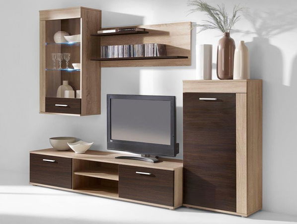 Moderní obývací stěna vhodná do menších bytů. Tato sestava je vyrobena z kvalitního lamina. Korpus a část předních dvířek jsou barvy dřeva dub sonoma a dvířka jsou doplněny o barvu wenge. Obývací stěnu si můžete objednat s nebo bez LED osvětlení vitríny.