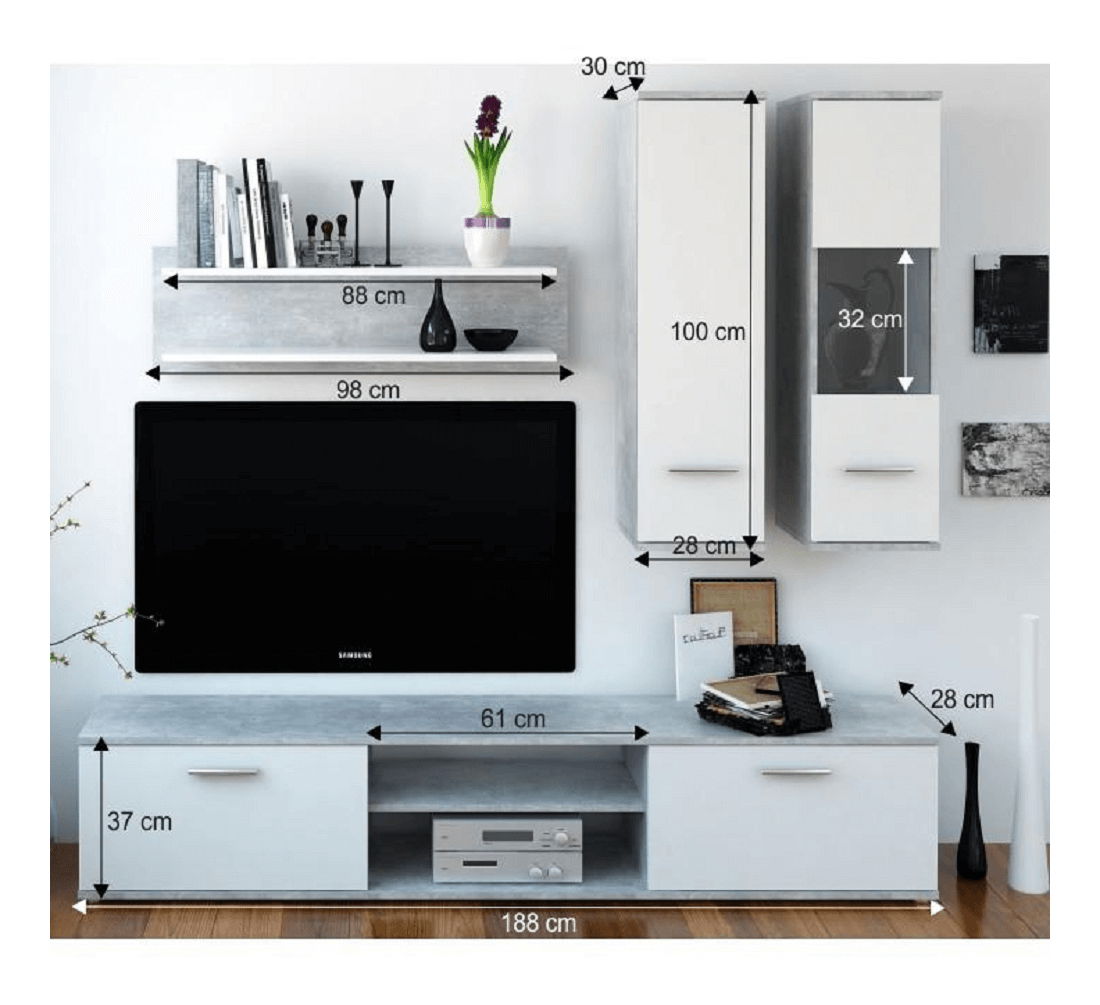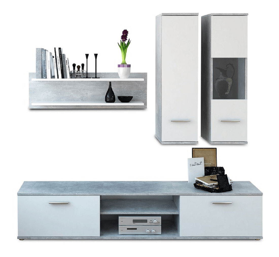 Moderní a praktická obývací stěna s jednodušším, ale všestranným designem, který se dá kombinovat s jinými prvky. Komponenty obývací stěny jsou: TV stolek, polička na stěnu, skříňka na stěnu a vitrína na stěnu. Komponenty jsou vyrobeny z fóliované dřevotřísky. Barevné provedení obývací stěny je beton v kombinaci s bílou.