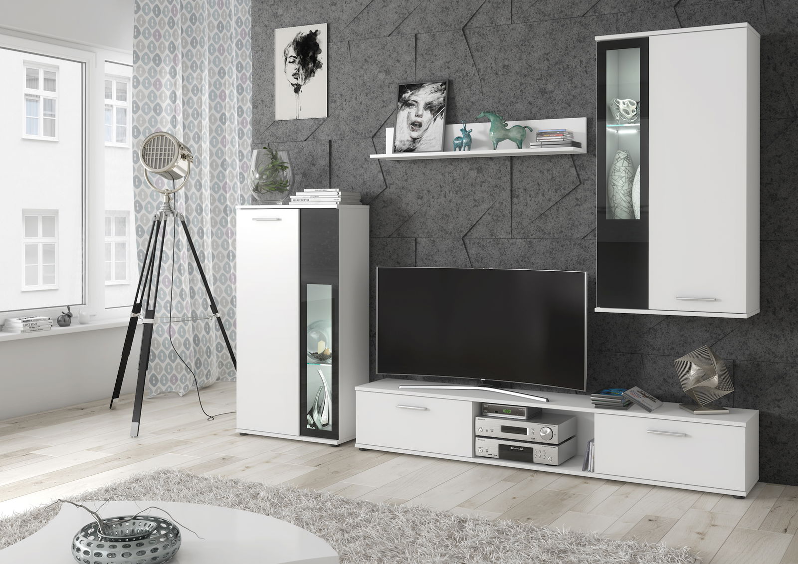 Obývací stěna Willa 29 WS WW (bílá + černé sklo) (s osvětlením)