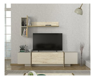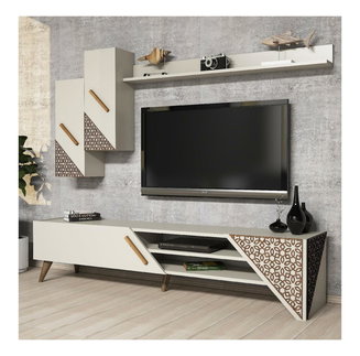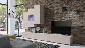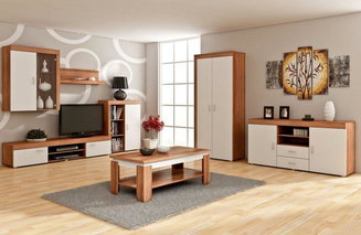 Obývací stěna se skládá z několika samostatně stojících prvků nebo jsou jednotlivé kusy nábytku k sobě přimontovány. Obvykle jsou to TV stolky, vitríny, poličky a menší skříňky. Minimalistický styl představuje sestava stolku pod televizor s vyššími nožičkami, jedna polička a maximálně dva závěsné úzké regály nebo vitríny. Pokud potřebujete více úložného prostoru, vybírejte z nabídky luxusních obývacích stěn z masivního dřeva. Oblíbená je také kombinace dřevěného korpusu a dvířek v lesklém finiši.