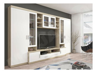 Obývací stěna se skládá z několika samostatně stojících prvků nebo jsou jednotlivé kusy nábytku k sobě přimontovány. Obvykle jsou to TV stolky, vitríny, poličky a menší skříňky. Minimalistický styl představuje sestava stolku pod televizor s vyššími nožičkami, jedna polička a maximálně dva závěsné úzké regály nebo vitríny. Pokud potřebujete více úložného prostoru, vybírejte z nabídky luxusních obývacích stěn z masivního dřeva. Oblíbená je také kombinace dřevěného korpusu a dvířek v lesklém finiši.